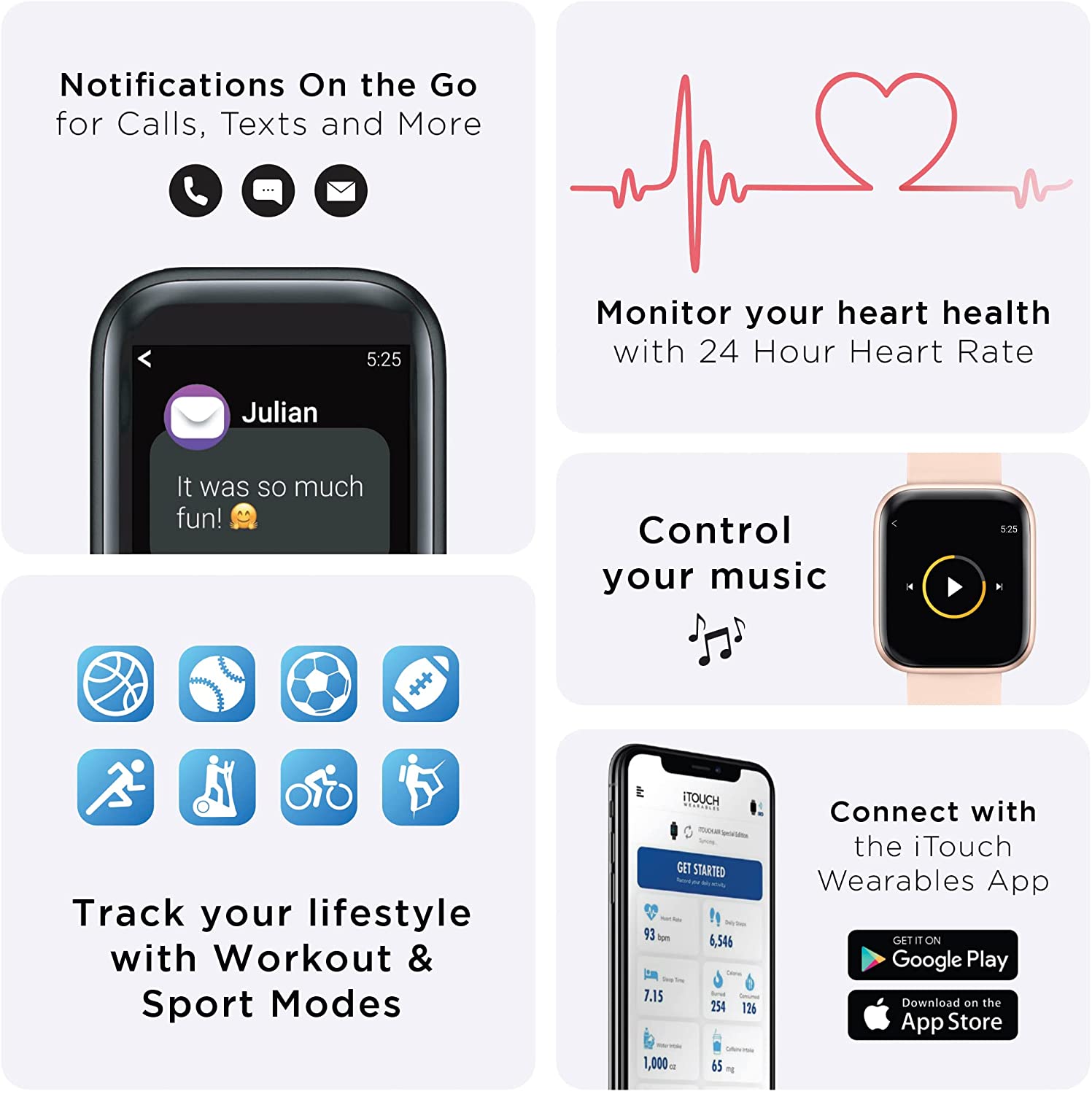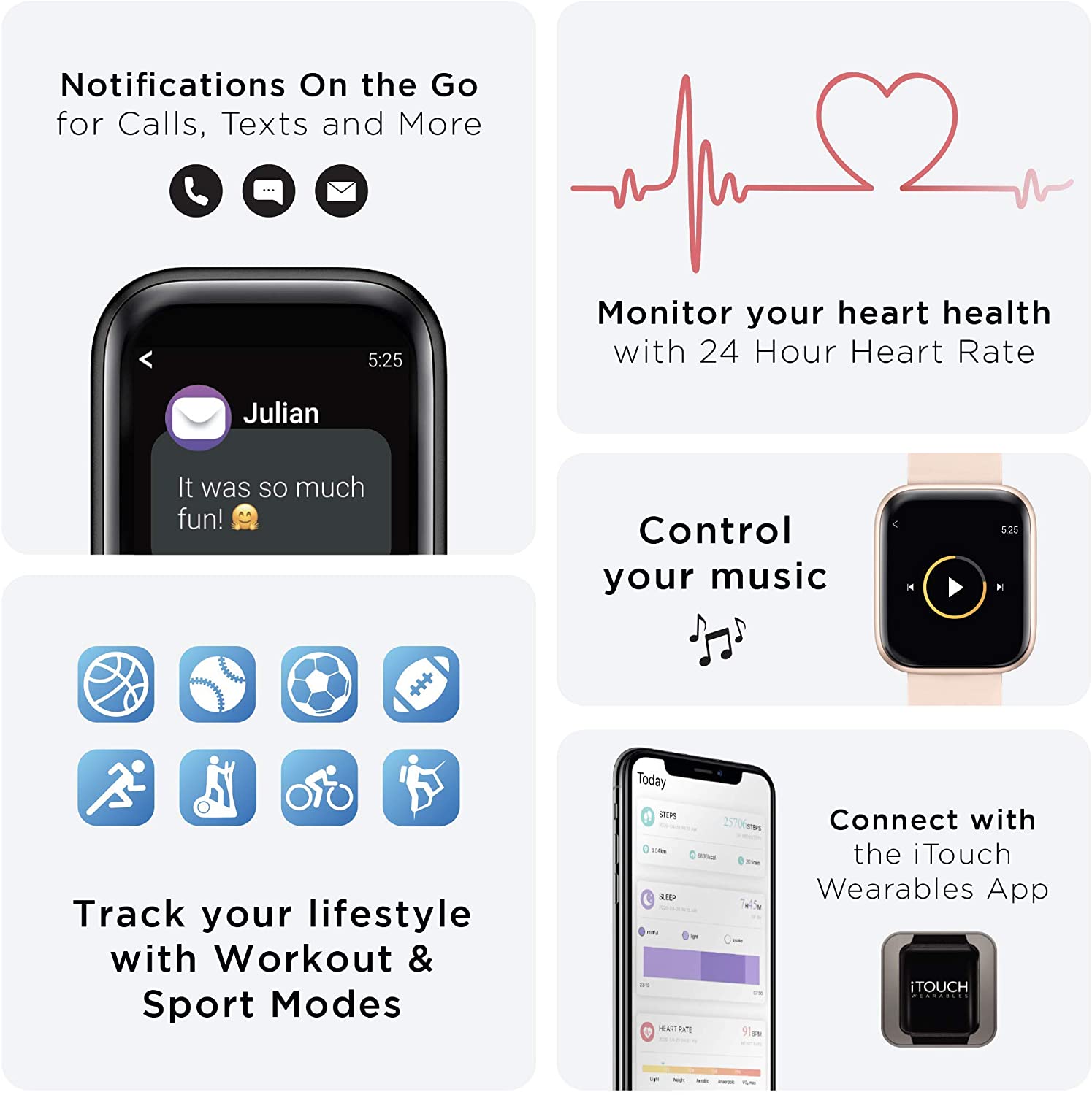 - HEALTH AND FITNESS TRACKER: Use the iTouch Air 3 wearable fitness tracker to monitor your activity and to stay motivated while you reach your workout goals. With this smartwatch, stay on top of your health while staying in touch with others. Features a hydration reminder, breathing exervises, hygiene assistant, and an elevated heartrate reminder.